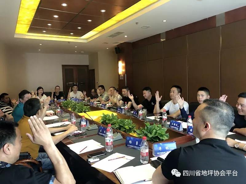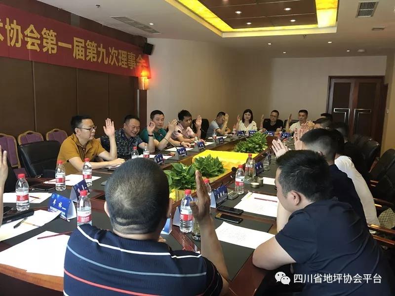 2019年5月18日,四川省地坪工程技术协会第一届第九次理事会在成都金玉阳光酒店隆重举行。协会20家常驻成都理事单位代表出席本次会议,会议就协会年度中心工作进行了梳理与规划,与会代表针对会议议题展开专项讨论并逐条形成会议决议。